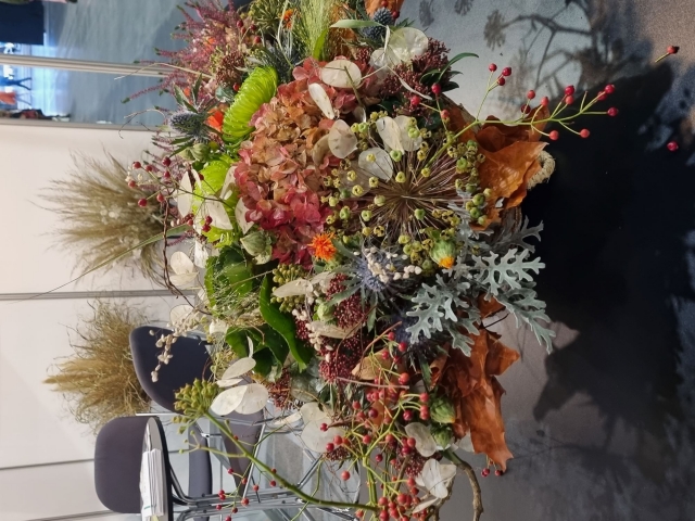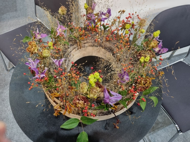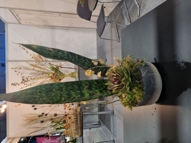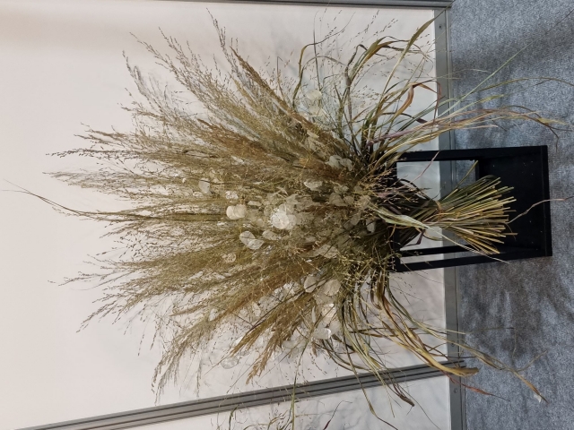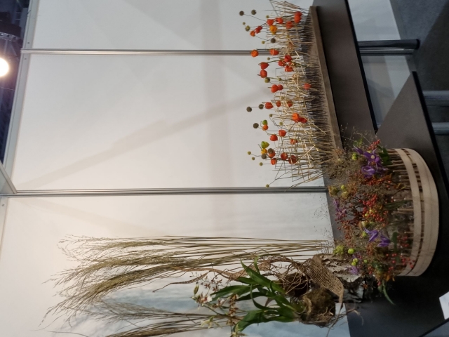 Wystrój stanowiska po raz kolejny skupiał się na roślinach gruntowych o charakterze jesiennym. Zwrot ku roślinom uprawianym w gruncie oraz rodzimym gatunkom wynika z chęci podkreślenia ich rosnącego znaczenia zarówno we florystyce, jak i architekturze krajobrazu. Na stanowisku pojawiły się okazałe bukiety z traw ozdobnych ze Szkółki Traw Henschke oraz kompozycje wykonane przez florystki z sekcji florystycznej SITO: Różę Marciniak, Agatę Witkowską oraz Annę Wawrzyniak. Po pokazach ekspozycja wzbogaciła się o prace wykonane na scenie.